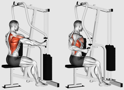 Lat Pulldown. Comhcheangail le heachtraí ró-ghránna ró-ghreamaithe le héadóipí faoi láimh gar-ghreamaithe, 4 tacar an ceann, 10–12 ionadaí in aghaidh an tsraith.